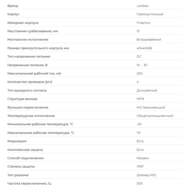 Бесконтактный выключатель LE40SZSF15DNO-E2 3520 руб. Купить в 1 клик В корзину Индуктивный выключатель с поворотной частью LE40SZSF15DNO-E2 В связи с обновлением сайта, актуальную цену уточняйте при заказе. Отправка датчиков осуществляется во все регионы России. Индуктивный выключатель с поворотной частью LE40SZSF15DNO-E2 В связи с обновлением сайта, актуальную цену уточняйте при заказе. Отправка датчиков осуществляется во все регионы России. Описание Описание Индуктивный датчик LE40SZSF15DNO-E2 имеет поворотную головку, которая позволяет менять направление чувствительной поверхности. Это дает возможность адаптировать конструкцию датчика к каждой конкретной задаче. Характеристики: С этим товаром покупаютВ корзинуСветосигнальная колонна ESPE WSLF-524BN-RYGBW5 460 ₽ В корзинуВ корзинуИзмерительная завеса ESPE ESCL9640L2IS-20по запросу В корзину